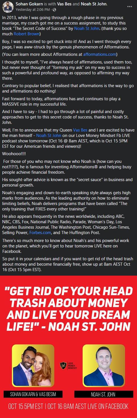 NOAH ST. JOHN es el inventor del Método AFFORMACIONES® y fundador de SuccessClinic.com, una empresa internacional de formación para el éxito.
